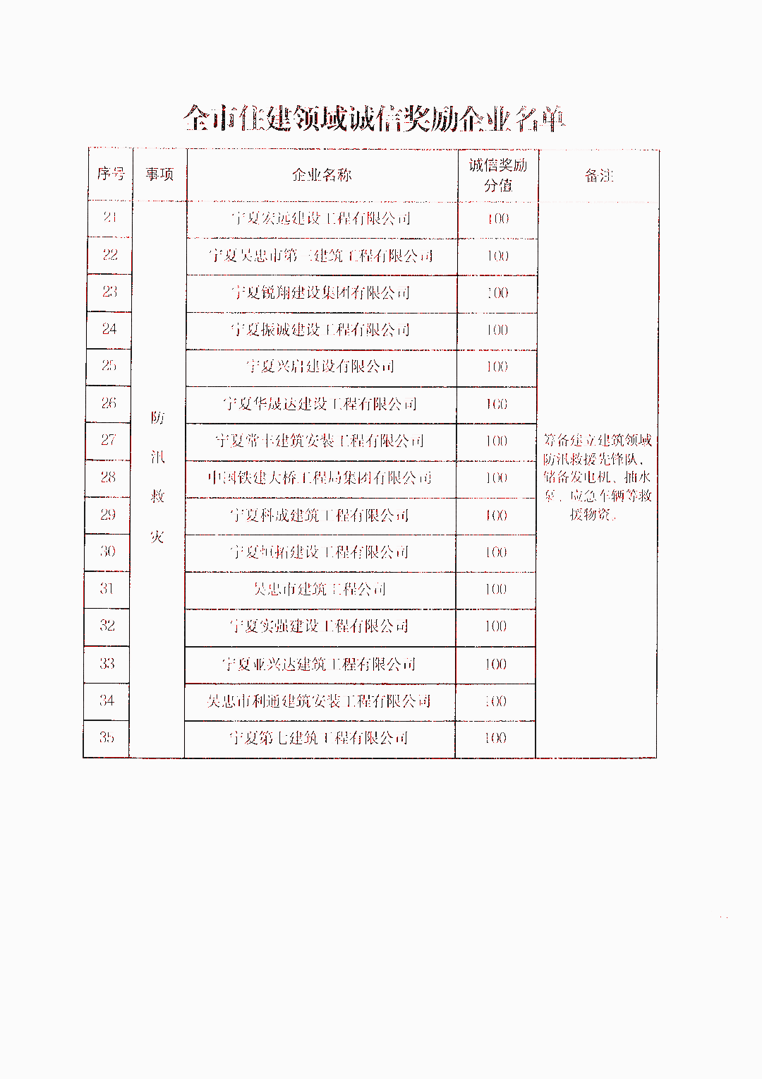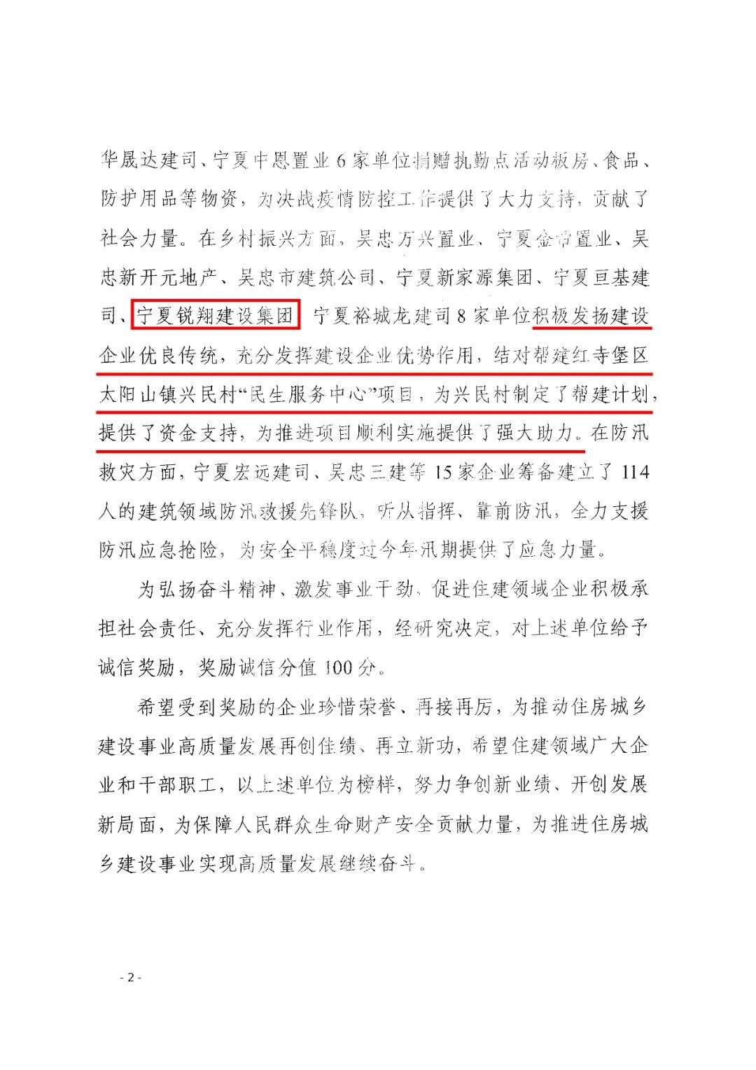 喜報(bào) | 寧夏銳翔建設(shè)集團(tuán)有限公司關(guān)于結(jié)對幫建紅寺堡區(qū)“民生服務(wù)中心”項(xiàng)目及防汛救援先鋒隊(duì)誠信獎勵的通報(bào)發(fā)表時(shí)間:2024-10-21 11:42 寧夏銳翔建設(shè)集團(tuán)等8家單位積極發(fā)揚(yáng)建設(shè)企業(yè)優(yōu)良傳統(tǒng),充分發(fā)揮建設(shè)企業(yè)優(yōu)勢作用,結(jié)對幫建紅寺堡區(qū)太陽山鎮(zhèn)興民“民生服務(wù)中心”項(xiàng)目,為興民村制定了幫建計(jì)劃,提供了資金支持,為推進(jìn)項(xiàng)目順利實(shí)施提供了強(qiáng)大主力。 在防汛救災(zāi)方面,寧夏銳翔建設(shè)集團(tuán)等15家企業(yè)籌備建立了114人的建筑領(lǐng)域防汛救援先鋒隊(duì),聽從指揮、靠前防汛,全力支援防汛應(yīng)急搶險(xiǎn),為安全平穩(wěn)度過去年汛期提供了應(yīng)急力量。