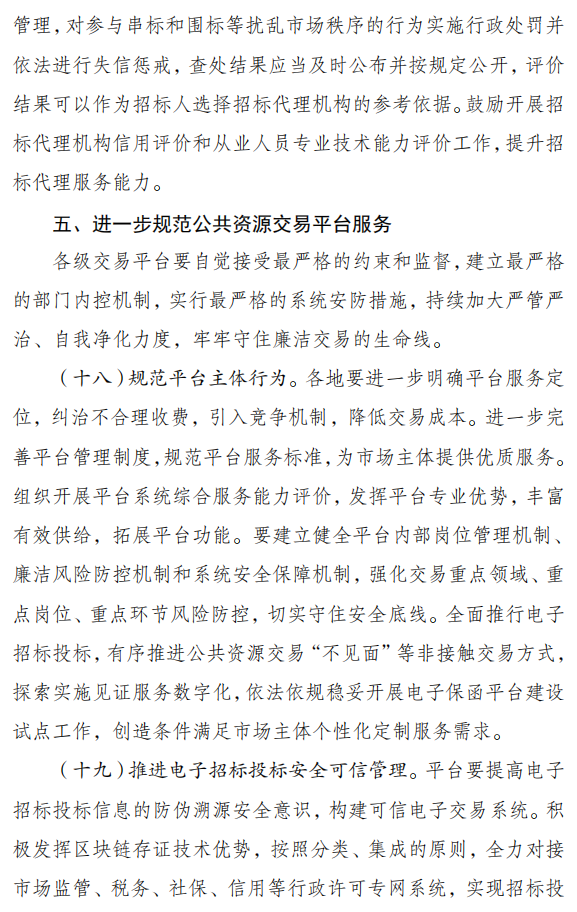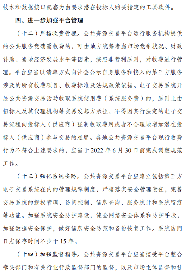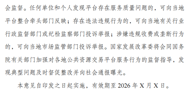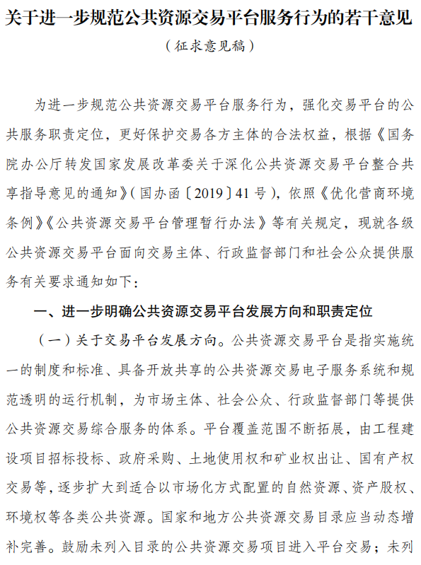國家發(fā)展改革委關(guān)于向社會(huì)征求對《關(guān)于進(jìn)一步規(guī)范公共資源交易平臺服務(wù)行為的若干意見(征求意見稿)》意見的公告 為進(jìn)一步規(guī)范公共資源交易平臺服務(wù)行為,強(qiáng)化公共資源交易平臺的公共服務(wù)職能定位,更好保護(hù)交易各方主體的合法權(quán)益,依照《優(yōu)化營商環(huán)境條例》和《國務(wù)院辦公廳轉(zhuǎn)發(fā)國家發(fā)展改革委關(guān)于深化公共資源交易平臺整合共享指導(dǎo)意見的通知》(國辦函〔2019〕41號)有關(guān)規(guī)定,我們商國務(wù)院有關(guān)部門和地方研究起草了《關(guān)于進(jìn)一步規(guī)范公共資源交易平臺服務(wù)行為的若干意見(征求意見稿)》,現(xiàn)予公告,向社會(huì)公開征求意見。 此次公開征求意見的時(shí)間為2021年9月30日至10月30日。歡迎各界人士通過網(wǎng)絡(luò)、傳真等方式提出意見,請登錄國家發(fā)展改革委門戶網(wǎng)站(http://www.ndrc.gov.cn)首頁“意見征求”專欄,進(jìn)入“《關(guān)于進(jìn)一步規(guī)范公共資源交易平臺服務(wù)行為的若干意見》公開征求意見”欄目,提出意見建議。電子郵件請發(fā)至luyan@ndrc.gov.cn,傳真請發(fā)至(010)68502514。 感謝您的參與和支持! 附件:《關(guān)于進(jìn)一步規(guī)范公共資源交易平臺服務(wù)行為的若干意見(征求意見稿)》 國家發(fā)展改革委 2021年9月30日