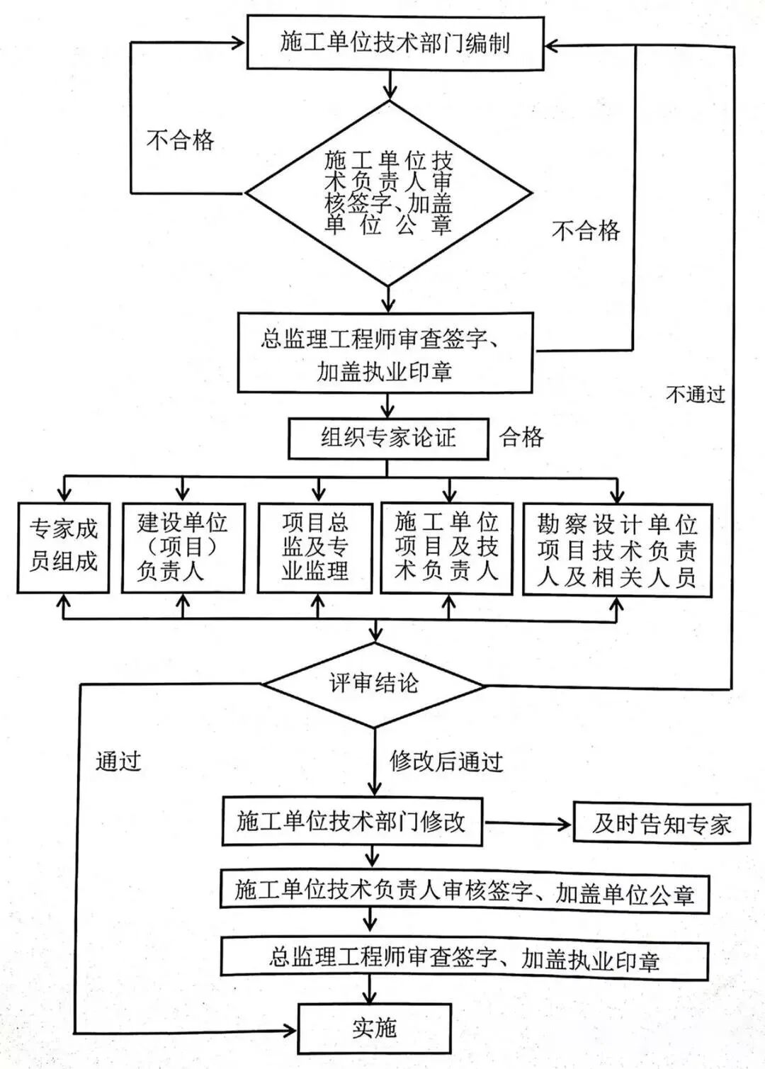 【專家論證、方案評審】 對于超過一定規(guī)模的危大工程,施工單位應當組織召開專家論證會對專項施工方案進行論證。實行施工總承包的,由施工總承包單位組織召開專家論證會。專家論證前專項施工方案應當通過施工單位審核和總監(jiān)理工程師審查。 專家論證會后,應當形成論證報告,對專項施工方案提出通過、修改后通過或者不通過的一致意見。專家對論證報告負責并簽字確認。 專項施工方案經(jīng)論證需修改后通過的,施工單位應當根據(jù)論證報告修改完善后,專項施工方案應當由施工單位技術負責人審核簽字、加蓋單位公章,并由總監(jiān)理工程師審查簽字、加蓋執(zhí)業(yè)印章后方可實施。 專項施工方案經(jīng)論證不通過的,施工單位修改后應當按照本規(guī)定的要求重新組織專家論證。 【參會人員】 超過一定規(guī)模的危大工程專項施工方案專家論證會的參會人員應當包括: (一)專家(專家應當從地方人民政府住房城鄉(xiāng)建設主管部門建立的專家?guī)熘羞x取,符合專業(yè)要求且人數(shù)不得少于5名,與本工程有利害關系的人員不得以專家身份參加專家論證會); (二)建設單位項目負責人; (三)有關勘察、設計單位項目技術負責人及相關人員; (四)總承包單位和分包單位技術負責人或授權委派的專業(yè)技術人員、項目負責人、項目技術負責人、專項施工方案編制人員、項目專職安全生產(chǎn)管理人員及相關人員; (五)監(jiān)理單位項目總監(jiān)理工程師及專業(yè)監(jiān)理工程師。 【論證內(nèi)容】 對于超過一定規(guī)模的危大工程專項施工方案,專家論證的主要內(nèi)容應當包括: (一)專項施工方案內(nèi)容是否完整、可行; (二)專項施工方案計算書和驗算依據(jù)、施工圖是否符合有關標準規(guī)范; (三)專項施工方案是否滿足現(xiàn)場實際情況,并能夠確保施工安全。 【附】 危險性較大的分部分項工程范圍 一、基坑工程 (一)開挖深度超過3m(含3m)的基坑(槽)的土方開挖、支護、降水工程。 (二)開挖深度雖未超過3m,但地質(zhì)條件、周圍環(huán)境和地下管線復雜,或影響毗鄰建、構筑物安全的基坑(槽)的土方開挖、支護、降水工程。 二、模板工程及支撐體系 (一)各類工具式模板工程:包括滑模、爬模、飛模、隧道模等工程。 (二)混凝土模板支撐工程:搭設高度5m及以上,或搭設跨度10m及以上,或施工總荷載(荷載效應基本組合的設計值,以下簡稱設計值)10kN/m2及以上,或集中線荷載(設計值)15kN/m及以上,或高度大于支撐水平投影寬度且相對獨立無聯(lián)系構件的混凝土模板支撐工程。 (三)承重支撐體系:用于鋼結構安裝等滿堂支撐體系。 三、起重吊裝及起重機械安裝拆卸工程 (一)采用非常規(guī)起重設備、方法,且單件起吊重量在10kN及以上的起重吊裝工程。 (二)采用起重機械進行安裝的工程。 (三)起重機械安裝和拆卸工程。 四、腳手架工程 (一)搭設高度24m及以上的落地式鋼管腳手架工程(包括采光井、電梯井腳手架)。 (二)附著式升降腳手架工程。 (三)懸挑式腳手架工程。 (四)高處作業(yè)吊籃。 (五)卸料平臺、操作平臺工程。 (六)異型腳手架工程。 五、拆除工程 可能影響行人、交通、電力設施、通訊設施或其它建、構筑物安全的拆除工程。 六、暗挖工程 采用礦山法、盾構法、頂管法施工的隧道、洞室工程。 七、其它 (一)建筑幕墻安裝工程。 (二)鋼結構、網(wǎng)架和索膜結構安裝工程。 (三)人工挖孔樁工程。 (四)水下作業(yè)工程。 (五)裝配式建筑混凝土預制構件安裝工程。 (六)采用新技術、新工藝、新材料、新設備可能影響工程施工安全,尚無國家、行業(yè)及地方技術標準的分部分項工程。 超過一定規(guī)模的危險性較大的分部分項工程范圍 一、深基坑工程 開挖深度超過5m(含5m)的基坑(槽)的土方開挖、支護、降水工程。 二、模板工程及支撐體系 (一)各類工具式模板工程:包括滑模、爬模、飛模、隧道模等工程。 (二)混凝土模板支撐工程:搭設高度8m及以上,或搭設跨度18m及以上,或施工總荷載(設計值)15kN/m2及以上,或集中線荷載(設計值)20kN/m及以上。 (三)承重支撐體系:用于鋼結構安裝等滿堂支撐體系,承受單點集中荷載7kN及以上。 三、起重吊裝及起重機械安裝拆卸工程 (一)采用非常規(guī)起重設備、方法,且單件起吊重量在100kN及以上的起重吊裝工程。 (二)起重量300kN及以上,或搭設總高度200m及以上,或搭設基礎標高在200m及以上的起重機械安裝和拆卸工程。 四、腳手架工程 (一)搭設高度50m及以上的落地式鋼管腳手架工程。 (二)提升高度在150m及以上的附著式升降腳手架工程或附著式升降操作平臺工程。 (三)分段架體搭設高度20m及以上的懸挑式腳手架工程。 五、拆除工程 (一)碼頭、橋梁、高架、煙囪、水塔或拆除中容易引起有毒有害氣(液)體或粉塵擴散、易燃易爆事故發(fā)生的特殊建、構筑物的拆除工程。 (二)文物保護建筑、優(yōu)秀歷史建筑或歷史文化風貌區(qū)影響范圍內(nèi)的拆除工程。 六、暗挖工程 采用礦山法、盾構法、頂管法施工的隧道、洞室工程。 七、其它 (一)施工高度50m及以上的建筑幕墻安裝工程。 (二)跨度36m及以上的鋼結構安裝工程,或跨度60m及以上的網(wǎng)架和索膜結構安裝工程。 (三)開挖深度16m及以上的人工挖孔樁工程。 (四)水下作業(yè)工