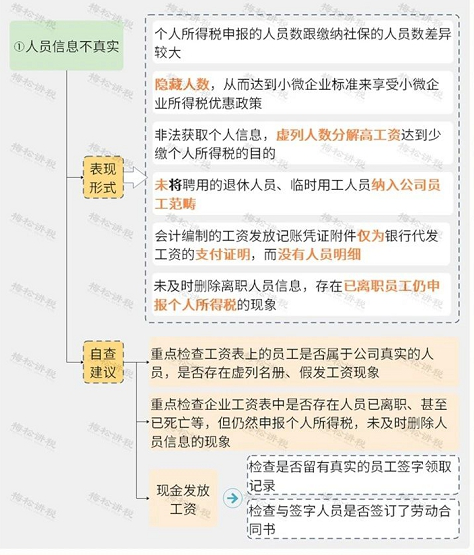 一些公司明明支付的是勞務(wù)費(fèi),卻因?yàn)闊o法取得發(fā)票,而變成工資發(fā)放。 03 2021年稅務(wù) 這樣查企業(yè) 根據(jù)企業(yè)情況,稽查人員針對企業(yè)賬簿中的工資費(fèi)用項(xiàng)目,主要從以下4個方面入手實(shí)施核查: 檢查企業(yè)的人員花名冊、考勤表、工資明細(xì)賬和計算表,審核工資發(fā)放憑證與銀行代發(fā)工資卡等憑證資料的數(shù)據(jù)是否對應(yīng)無差異。 稽查人員分析企業(yè)記賬憑證和原始憑證,結(jié)合企業(yè)生產(chǎn)經(jīng)營情況和生產(chǎn)規(guī)模,核實(shí)從業(yè)職工人數(shù)和薪酬標(biāo)準(zhǔn),重點(diǎn)核實(shí)月工資額低于5000元的人數(shù)占比情況。 審查分析企業(yè)“應(yīng)付職工薪酬”賬戶與實(shí)付工資總額是否對應(yīng),核對各種津貼、補(bǔ)貼、獎金的發(fā)放是否正確。檢查“應(yīng)付福利費(fèi)”賬戶支出情況,核實(shí)企業(yè)通過該賬戶發(fā)放現(xiàn)金和實(shí)物的具體情況,看是否代扣代繳個稅。 利用金稅三期系統(tǒng)和社保系統(tǒng),核查工資表中人員與企業(yè)繳納社保人員在數(shù)量上是否存在較大差異,并對企業(yè)申報個人所得稅人員的比例和收入情況實(shí)施核查。 04 注意了,8類風(fēng)險點(diǎn) 不想被罰,趕緊對照自查! 為啥稅務(wù)局一查工資就會有問題?請對照自查一下,企業(yè)是否存在以下25個風(fēng)險點(diǎn)。 1、虛列人員