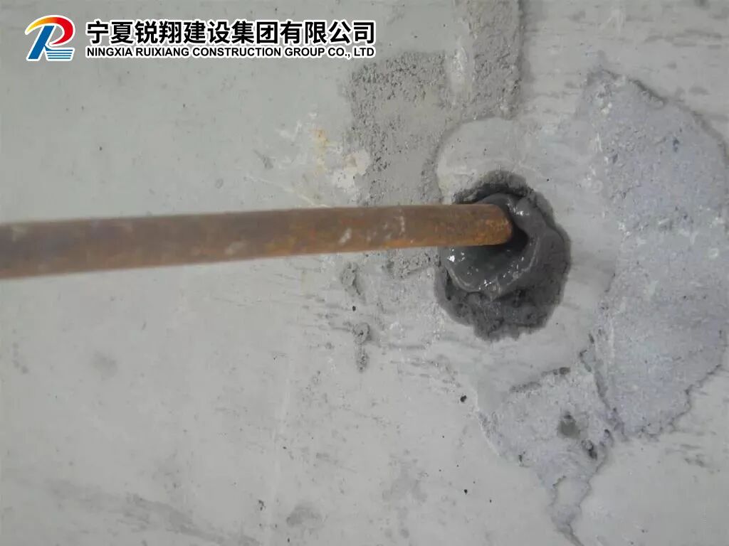 外墻螺桿洞封堵工藝流程 6、待凝固后以外墻螺栓洞口為中心,涂刷水泥基防水涂料JS,厚度1.5mm,直徑150mm。 現(xiàn)場施工示例