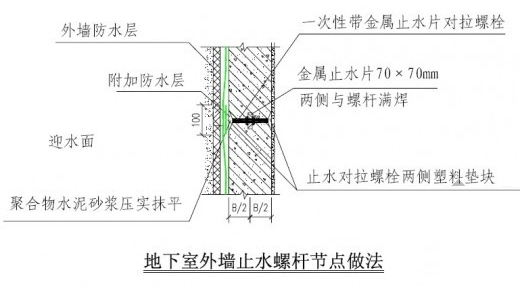 完成防水施工后 止水螺桿節(jié)點(diǎn)處理 做法說明: 在施工防水層前,應(yīng)逐個將螺桿位置處的凹槽用1:2聚合物水泥砂漿壓實抹平。 工藝流程: