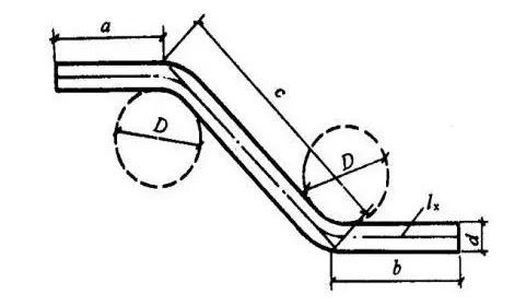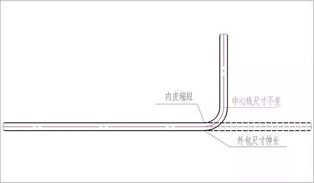 還有曾經(jīng)比較常見的圓盤條,主要是光圓鋼筋,現(xiàn)在已經(jīng)不常用了。 因此,就要通過鋼筋工把進(jìn)場的直線狀態(tài)的鋼筋加工成我們所需要的樣子,也就是配筋圖要求的樣子。這時候就必然出現(xiàn)鋼筋的彎曲、搭接、焊接、切斷。而這種成型鋼筋,到底需要多少進(jìn)場鋼筋才能加工出來,也就是確定成型鋼筋在直線狀態(tài)下需要多少長度,這樣才能對進(jìn)場鋼筋進(jìn)行準(zhǔn)確切割。 這是一個很復(fù)雜的工作。這個工作就叫做鋼筋下料。 而在鋼筋下料中,對鋼筋長度影響最為復(fù)雜的就是鋼筋的彎曲。 作為一種具有良好變形性能的建筑材料,鋼筋彎曲的特點(diǎn)是在彎曲處內(nèi)皮縮短,外包尺寸伸長,而中心線尺寸不變(如下圖所示),所以我們只要把握住中心線尺寸,就可以得到鋼筋的下料長度。