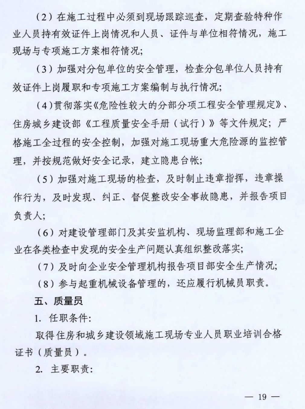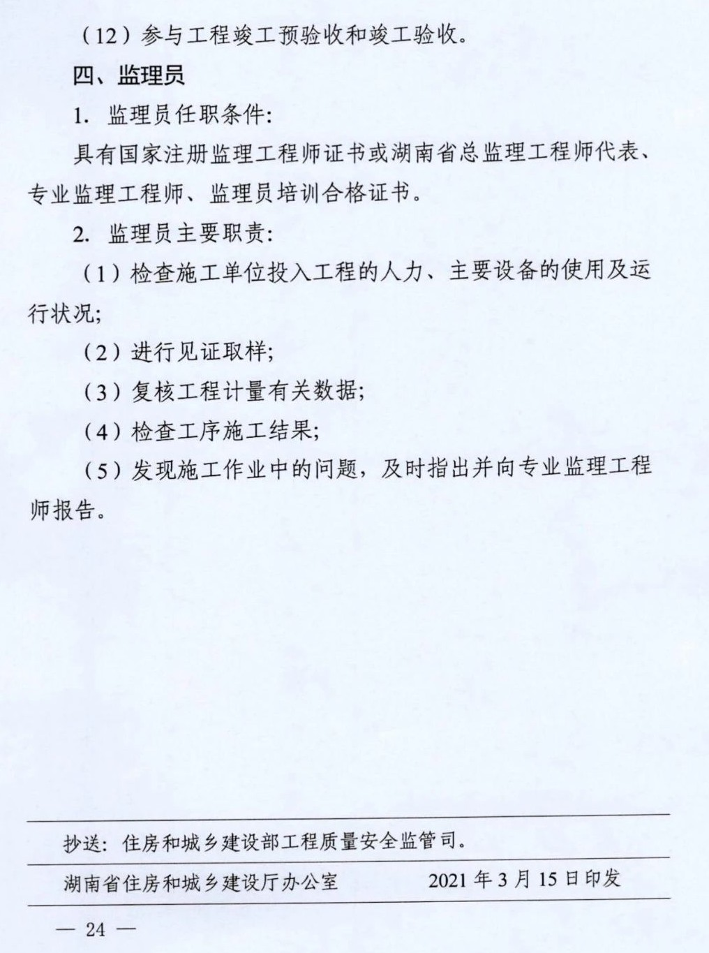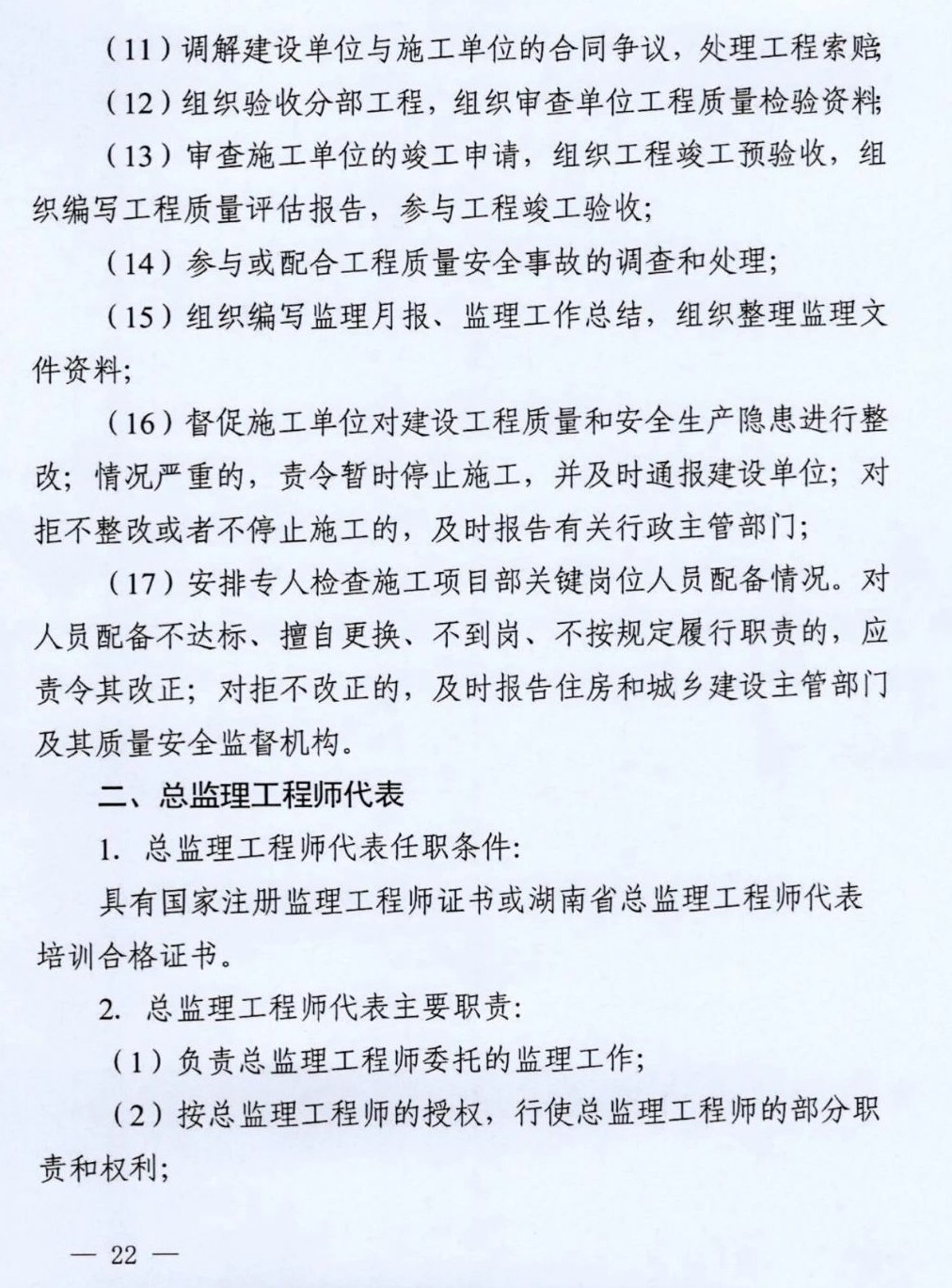 《湖南省建筑工程施工項(xiàng)目部和現(xiàn)場(chǎng)監(jiān)理部關(guān)鍵崗位人員配備管理辦法》 第一條 為規(guī)范我省房屋建筑和市政基礎(chǔ)設(shè)施工程(以下簡(jiǎn)稱(chēng)“建筑工程”)施工項(xiàng)目部現(xiàn)場(chǎng)監(jiān)理部關(guān)鍵崗位人員配備和管理,確保建筑工程質(zhì)量和安全生產(chǎn),根據(jù)《建設(shè)工程質(zhì)量管理?xiàng)l例》《建設(shè)工程安全生產(chǎn)管理?xiàng)l例》《湖南省建設(shè)工程質(zhì)量和安全生產(chǎn)管理?xiàng)l例》《建設(shè)工程消防設(shè)計(jì)審查驗(yàn)收管理暫行規(guī)定》(住房和城鄉(xiāng)建設(shè)部令第51號(hào))、住房和城鄉(xiāng)建設(shè)部《建筑施工企業(yè)安全生產(chǎn)管理機(jī)構(gòu)及專(zhuān)職安全生產(chǎn)管理人員配備辦法》(建質(zhì)(2008)91號(hào))、《住房和城鄉(xiāng)建設(shè)部關(guān)于印發(fā)建筑工程施工發(fā)包與承包違法行為認(rèn)定查處管理法的通知》(建市規(guī)(2019)1號(hào))和有關(guān)法律法規(guī)、標(biāo)準(zhǔn)規(guī)范等規(guī)定,結(jié)合本省實(shí)際,制定本辦法。 第二條 在本省行政區(qū)域內(nèi)從事新建、改建、擴(kuò)建房屋建筑工程(包括與其配套的線(xiàn)路管道和設(shè)備安裝工程、裝修工程)和市政基礎(chǔ)設(shè)施工程等活動(dòng)的施工項(xiàng)目部、現(xiàn)場(chǎng)監(jiān)理部關(guān)鍵崗位人員的考核、配備和管理適用本辦法。 本辦法所稱(chēng)施工項(xiàng)目部是指建筑施工企業(yè)為完成建筑工程施工合同任務(wù)派駐施工現(xiàn)場(chǎng)的施工管理機(jī)構(gòu);現(xiàn)場(chǎng)監(jiān)理部是指工程監(jiān)理企業(yè)根據(jù)建設(shè)工程監(jiān)理合同派駐施工現(xiàn)場(chǎng)的監(jiān)理機(jī)構(gòu)。 本辦法所稱(chēng)施工項(xiàng)目部關(guān)鍵崗位人員是指項(xiàng)目負(fù)責(zé)人、項(xiàng)目技術(shù)負(fù)責(zé)人、施工員、專(zhuān)職安全員、質(zhì)量員;現(xiàn)場(chǎng)監(jiān)理部關(guān)鍵崗位人員是指總監(jiān)理工程師(總監(jiān)代表)、專(zhuān)業(yè)監(jiān)理工程師、監(jiān)理員。 第三條 建筑工程施工項(xiàng)目部、現(xiàn)場(chǎng)監(jiān)理部關(guān)鍵崗位人員數(shù)量不得低于本辦法規(guī)定(施工項(xiàng)目部關(guān)鍵崗位人員配備標(biāo)準(zhǔn)見(jiàn)附件1、現(xiàn)場(chǎng)監(jiān)理部關(guān)鍵崗位人員配備標(biāo)準(zhǔn)見(jiàn)附件2),且必須按規(guī)定認(rèn)真履行崗位職責(zé)(施工項(xiàng)目部關(guān)鍵崗位人員任職條件和職責(zé)詳見(jiàn)附件3,現(xiàn)場(chǎng)監(jiān)理部關(guān)鍵崗位人員任職條件和職責(zé)詳見(jiàn)附件4)。施工企業(yè)應(yīng)根據(jù)工程需要配備其他相應(yīng)的管理人員。 建筑施工企業(yè)、工程監(jiān)理企業(yè)應(yīng)與任命的施工項(xiàng)目部、現(xiàn)場(chǎng)監(jiān)理部關(guān)鍵崗位人員訂立勞動(dòng)合同、建立勞動(dòng)工資關(guān)系。住房城鄉(xiāng)建設(shè)主管部門(mén)及其質(zhì)量安全監(jiān)督機(jī)構(gòu)監(jiān)督檢查時(shí),應(yīng)重點(diǎn)查驗(yàn)施工項(xiàng)目部項(xiàng)目負(fù)責(zé)人、項(xiàng)目技術(shù)負(fù)責(zé)人、專(zhuān)職安全員、質(zhì)量員以及現(xiàn)場(chǎng)監(jiān)理部總監(jiān)理工程師(總監(jiān)代表)是否由企業(yè)依法為其繳納社會(huì)養(yǎng)老保險(xiǎn)。 第四條 施工項(xiàng)目部關(guān)鍵崗位人員不得同時(shí)在其他建筑工程項(xiàng)目中任職。 經(jīng)建設(shè)單位同意,國(guó)家注冊(cè)監(jiān)理工程師可以在同一城市同時(shí)擔(dān)任不超過(guò)3個(gè)建筑工程項(xiàng)目(以監(jiān)理合同為準(zhǔn))的總監(jiān)理工程師。對(duì)在同一城市同時(shí)擔(dān)任多個(gè)建筑工程項(xiàng)目總監(jiān)理工程師的,監(jiān)理單位應(yīng)在其監(jiān)理的各個(gè)建筑工程項(xiàng)目現(xiàn)場(chǎng)配備總監(jiān)理工程師代表。專(zhuān)業(yè)監(jiān)理工程師、監(jiān)理員不得同時(shí)在2個(gè)及以上建筑工程項(xiàng)目的項(xiàng)目監(jiān)理部任職。安裝專(zhuān)業(yè)(水、電、暖通專(zhuān)業(yè))監(jiān)理工程師可以同時(shí)在同一城市不超過(guò)3個(gè)項(xiàng)目中任職,但須經(jīng)建設(shè)單位同意并報(bào)工程質(zhì)量安全監(jiān)督機(jī)構(gòu)。 第五條 工程項(xiàng)目建設(shè)單位在招標(biāo)文件中應(yīng)要求投標(biāo)人按國(guó)家和省有關(guān)法律法規(guī)、規(guī)范標(biāo)準(zhǔn)和本辦法規(guī)定配備建筑工程施工項(xiàng)目部、現(xiàn)場(chǎng)監(jiān)理部關(guān)鍵崗位人員。建筑施工企業(yè)、工程監(jiān)理企業(yè)在參與投標(biāo)時(shí),應(yīng)根據(jù)工程項(xiàng)目的規(guī)模、特點(diǎn)和招標(biāo)文件要求,在投標(biāo)文件中明確項(xiàng)目經(jīng)理、總監(jiān)理工程師配備情況及其他關(guān)鍵崗位人員數(shù)量。 招標(biāo)人在中標(biāo)通知書(shū)中應(yīng)注明項(xiàng)目經(jīng)理或總監(jiān)理工程師姓名及證號(hào)。招標(biāo)人或招標(biāo)代理機(jī)構(gòu)應(yīng)及時(shí)將項(xiàng)目負(fù)責(zé)人、總監(jiān)理工程師(總監(jiān)代表)信息錄入“湖南省工程項(xiàng)目動(dòng)態(tài)監(ji